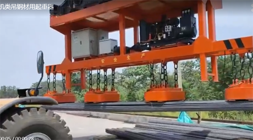大型吊車吊運(yùn)捆扎螺紋鋼用起重電磁鐵吸盤視頻展示