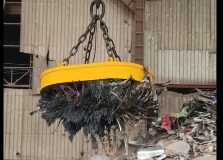 橢圓形吊廢鐵、廢渣、廢鋼用起重電磁鐵吸盤視頻展示