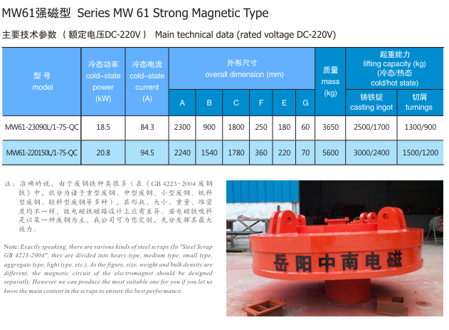 起重電磁鐵是一種適應(yīng)車廂形狀的橢圓形,所以能高效地裝、卸廢鋼鐵。磁場(chǎng)深,動(dòng)勢(shì)大,一次可吊起大量廢鋼鐵。用于窄小的車箱狀容器內(nèi)高效地裝卸廢鋼鐵。根據(jù)車箱形狀量身定做,對(duì)于吊運(yùn)廢鋼電磁鐵一般設(shè)計(jì)的料斗尺不一,故規(guī)格在不斷增加中,以下所表型號(hào)供參考。特殊尺寸可定制。