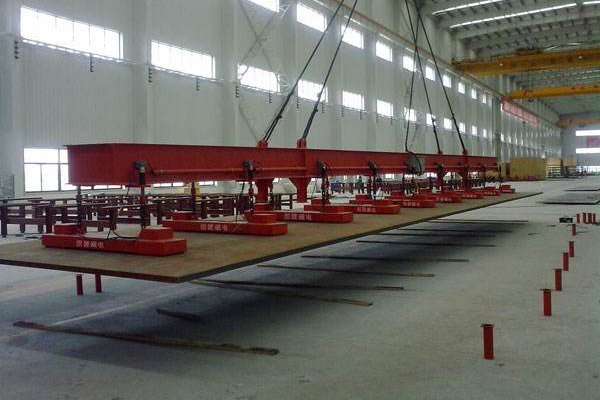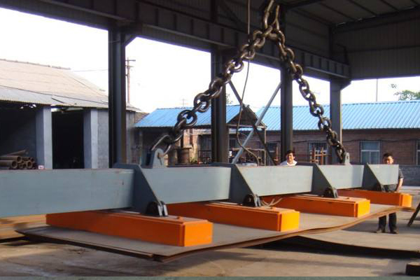 考慮到長鋼板吊運時可能出現(xiàn)的彎曲變形而影響安全搬運,所以在吊運長尺寸鋼板時,請使用多臺起重電磁鐵聯(lián)用。對于中厚板(6mm~32mm)起重電磁鐵的間距多取3~4米,兩端外伸部分的長度可取間距的二分之一。