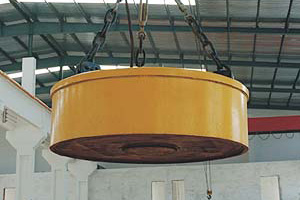 本系列除鐵器是為專門除去含在磁性礦石中的有害鐵件而設(shè)計(jì)的,其工作制為10%。使用時(shí),懸掛在皮帶輸送機(jī)上方的中部,并配以電動(dòng)小車,金屬探測器,采用PLC控制整流設(shè)備,吸料、分選、除鐵、回收等程序,從輸送的磁性礦石中除去有害鐵件,同時(shí)將被吸的磁性礦石又自動(dòng)地返送回輸送皮帶上得到回收。適用于除去各種磁鐵礦、燒結(jié)礦、球團(tuán)礦中的鐵磁性導(dǎo)物。