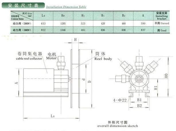 d.重量:卷盤及集電器重量見表,單個驅動器重量71kg,齒輪箱重量25kg(用戶可根據選用的卷盤外徑、集電器規(guī)格,驅動器數量及齒輪箱重量計算出總重量)