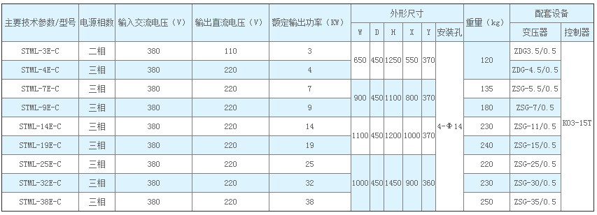 在控制柜額定容量大小19kw,整流變壓器帶罩外附;改進(jìn)型不配整流變壓器,直流由三相交流電源進(jìn)行橋式整流獲得直流電壓。