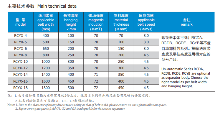 其工作原理:由永磁磁系或電磁鐵產(chǎn)生強大磁場,磁系下方設(shè)置一與除鐵器中心偏移量不大的旋轉(zhuǎn)盤(與除鐵器底部不接觸),其直徑為除鐵器外形的一倍,當(dāng)有鐵磁性物料經(jīng)過旋轉(zhuǎn)盤下方時,由于除鐵器的磁場吸引,會被吸附到旋轉(zhuǎn)盤上,隨著旋轉(zhuǎn)盤的轉(zhuǎn)動,被吸物被移到皮帶區(qū)域外部,此時除鐵器對鐵件的吸力降低,鐵磁性物料在離心力和重力的作用下,被甩到集鐵斗中。