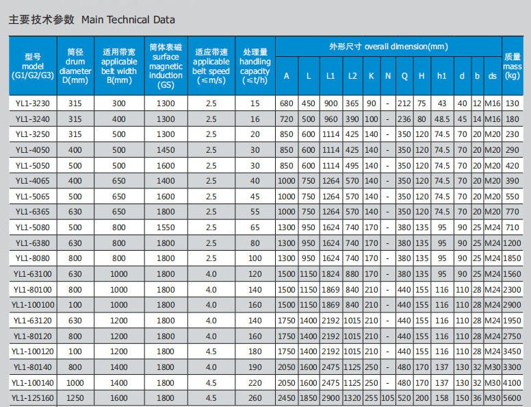 YL1系列永磁輪亦稱磁滑輪或干式大塊磁選機。其內(nèi)部采用高性能硬磁材料組成復(fù)合磁系,具有磁場強度高、深度大、結(jié)構(gòu)簡單、使用方便、不需維修、不消耗電力,常年使用不退磁等特點。廣泛用于水泥、磁選、礦山、鋼鐵、化工、耐火材料、垃圾處理等行業(yè)的選鐵。與DT-75型、AD-80型通用固定式皮帶輸送機配套使用代替主動輪,也可與專用皮帶輸送機配套。